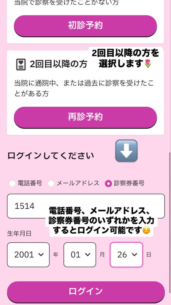 2回目以降の方を選択し、ログインすると予約をすることが可能となっております☺️